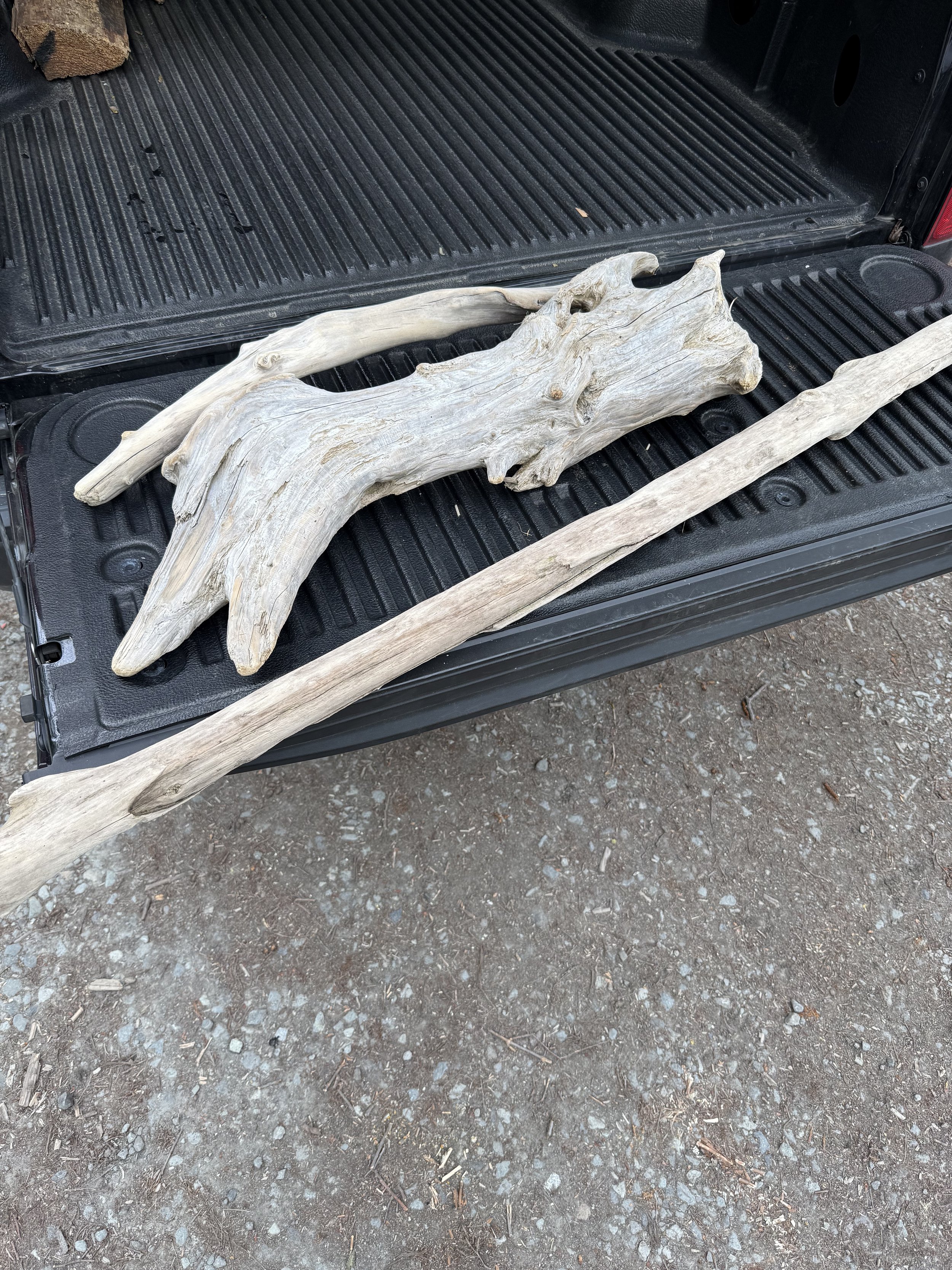 constructed from driftwood collected at a lake in gifford pinchot national forest, this table features a weathered, warped top supported by three naturally shaped legs. while camping in the area, curiosity led to moisture testing using a handheld meter—each piece measured under 10%. finished with a glass top to preserve form and provide structural stability.