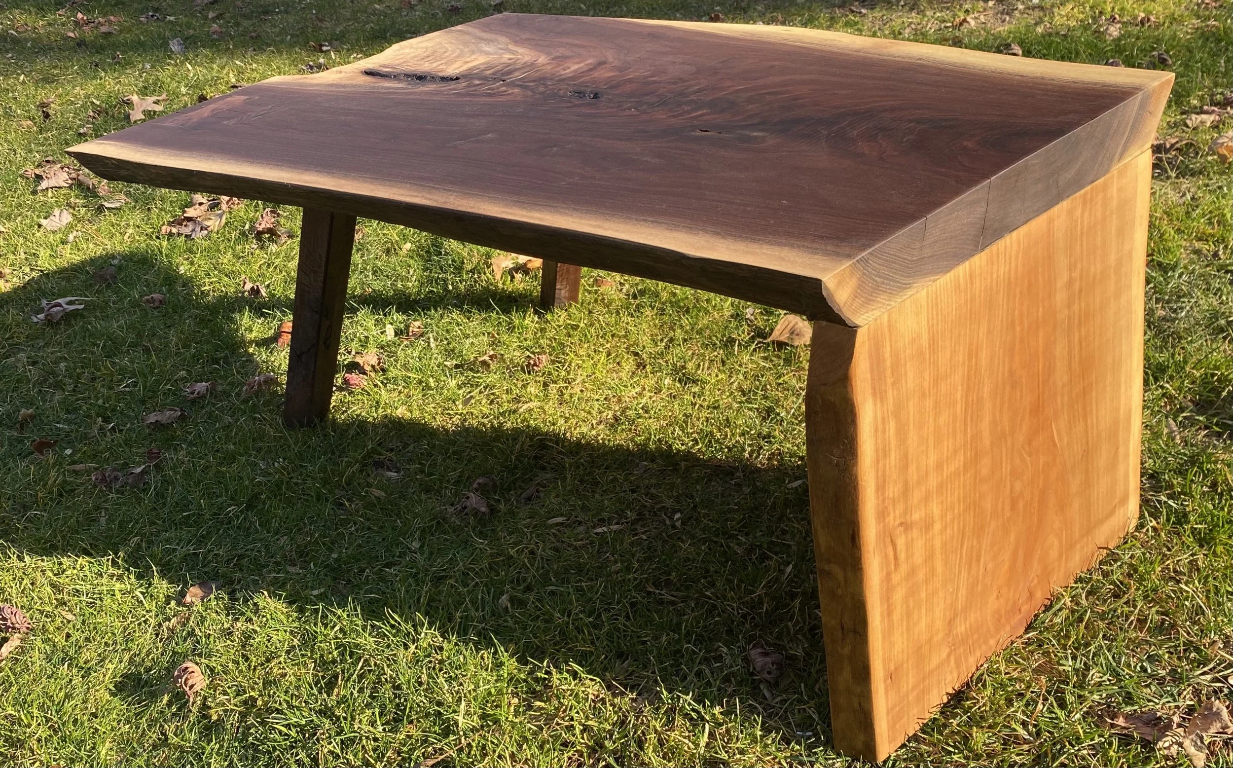 inspired by george nakashima’s minguren series, this bench is constructed from the crotch section of a black walnut slab—the area where branching occurs and the most dramatic grain figure of the tree is revealed. natural voids and edge variation are preserved, with two custom lathe-turned walnut legs and a cherry rear support grounding the piece. exposed cracks are stabilized with bowtie inlays.
